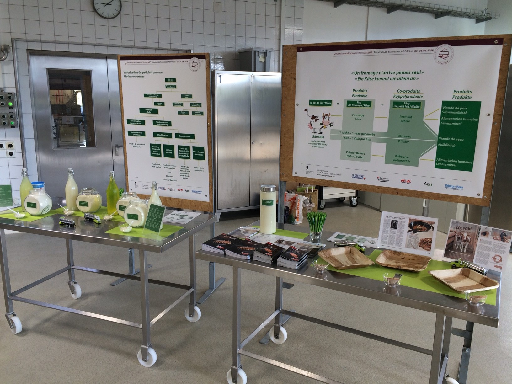 Les premières journées des fromages Suisses AOP se sont tenues du 22 au 24 avril 2016 à l'Institut agricole de Grangeneuve et ont attiré plus de 7'000 visiteurs. Ces journées ont donné l'occasion à Translait de présenter au public et aux professionnels de la branche qu'un Fromage n'arrive jamais seul. La fabrication d'un kilo de fromage nécessite en effet 10 kg de lait et produit en parallèle 9 kg de petit lait! Translait offre de par son activité des solutions pour la valorisation du petit lait autant dans le secteur animal que dans le secteur de l'alimentation humaine. Les nombreux visiteurs de notre stand ont pu déguster de la viande de veaux. En effet, en Suisse, 1 veau sur 4 est nourri avec des coproduits de l industrie laitière, à savoir du petit lait et du babeurre. Ces coproduits étant présents en suffisance sur le marché Suisse, ils offrent une solution écologique à l'engraissement des veaux, permettant ainsi d'éviter l'utilisation de lait entier dans l'alimentation animale. Les protéines du petit lait possèdent quant à elle un véritable intérêt nutritionnel en raison de leur composition élevée en acides aminés essentiels. Raison pour laquelle la branche de la nutrition infantile s'y intéresse fortement. Finalement, ces 3 jours ont permis aux visiteurs de connaître enfin ce que peuvent transporter nos nombreux camions!